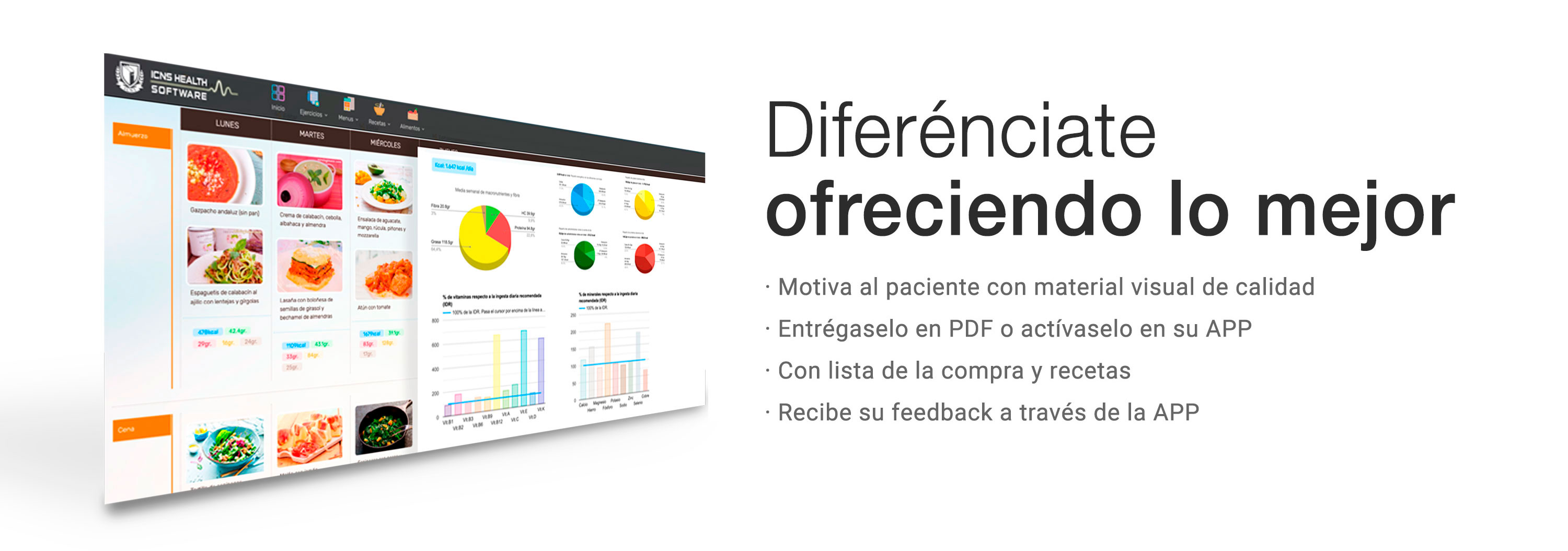 Podrás hacer un seguimiento completo consultando los datos de la entrevista dietética, con opción de personalizar las preguntas, las medidas antopométricas, de bioimpedancia, registro de ingestas con fotografías y video, feedback sobre las ingestas realizadas, marcadores de analíticas, actividad física, citas, pautas proporcionadas y conversaciones de chat.